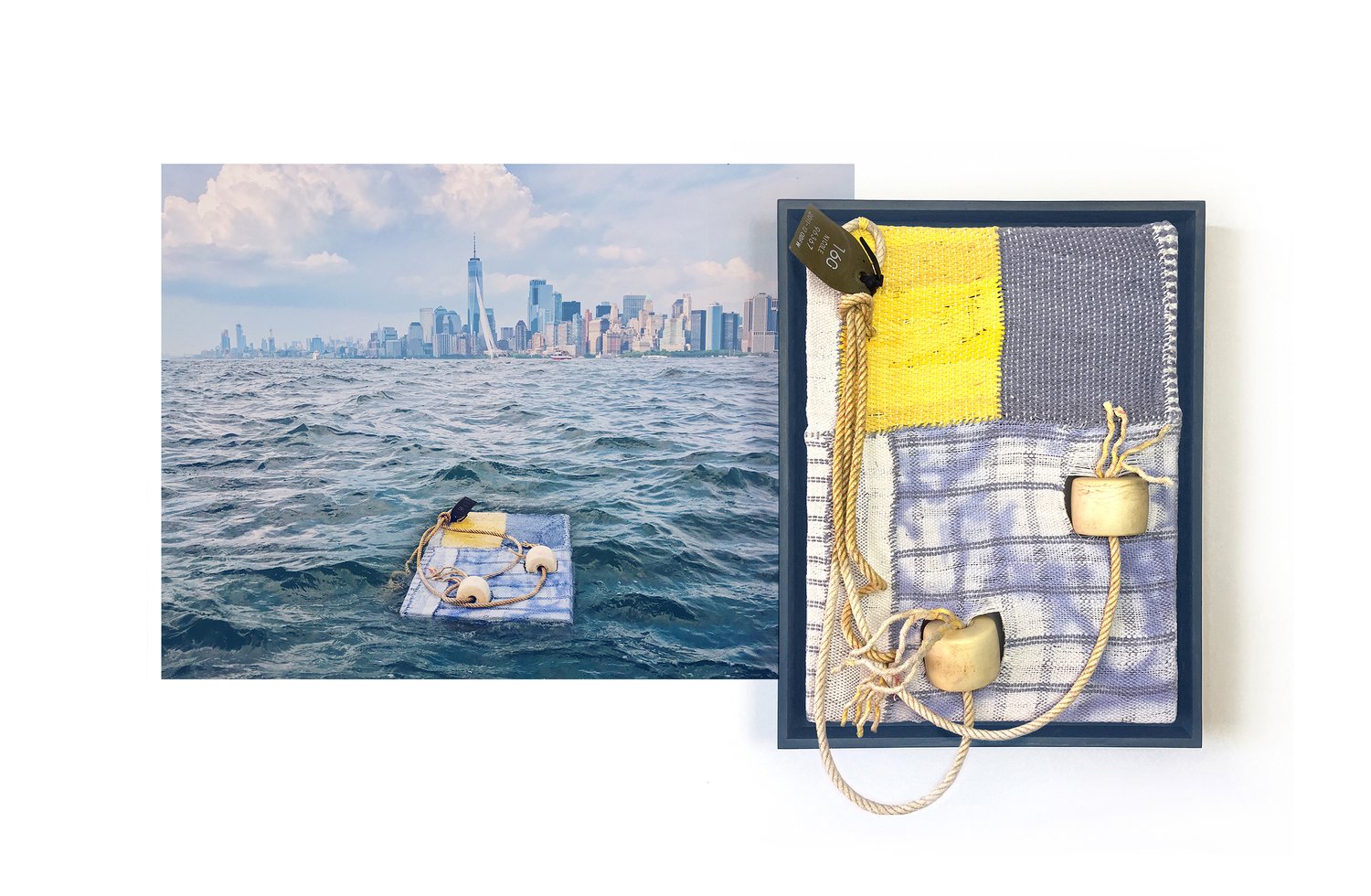 Acrylic and dye on hand-woven canvas, found net floats, rope, and identification tag